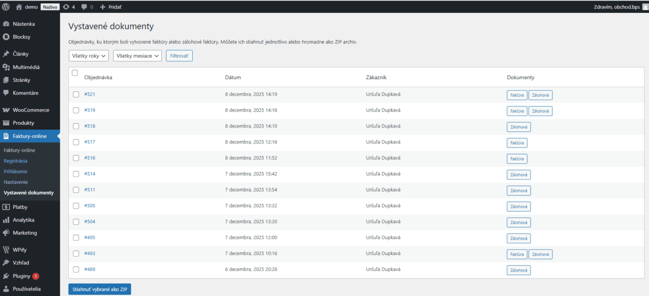 Od verzie 2.3 je dostupné sťahovanie vystavených zálohových faktúr a faktúr možné priamo v e-shope. Tlačidlo sa zobrazí len pre dokumenty vystavené od verzie 2.3 a viac.