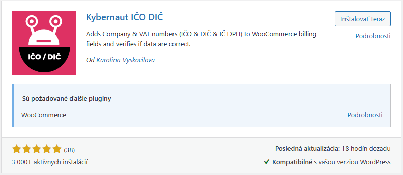 Pre správne zobrazovanie fakturačných údajov zákazníka odporúčame použiť plugin od Karolína Vyskočilová „Kybernaut IČO DIČ“, alebo WPify Woo Česko a Slovensko od WPify.